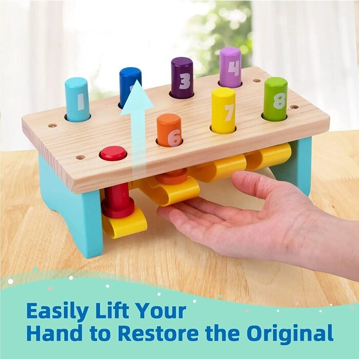 When they've finished just push the levers and the number counting pegs reappear. This pounding board is fun for many different ages and has endless play for whacking fun.